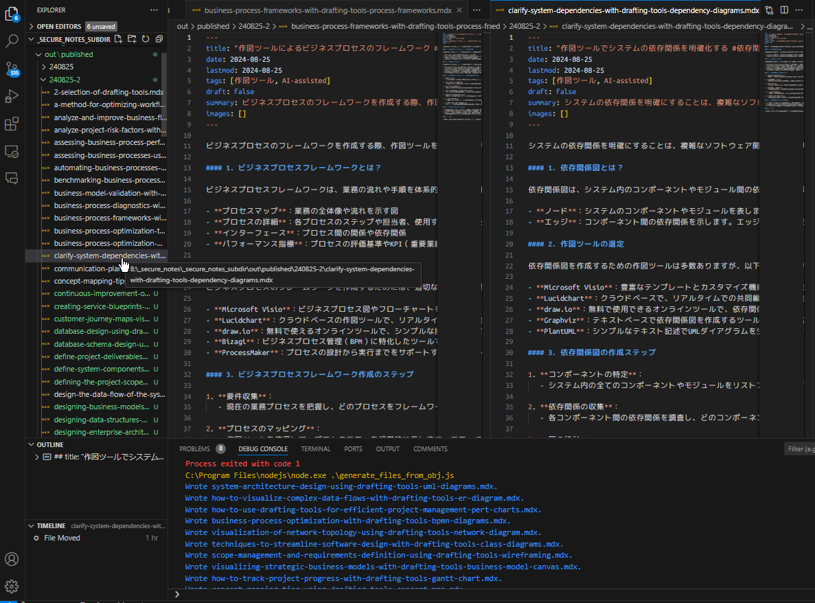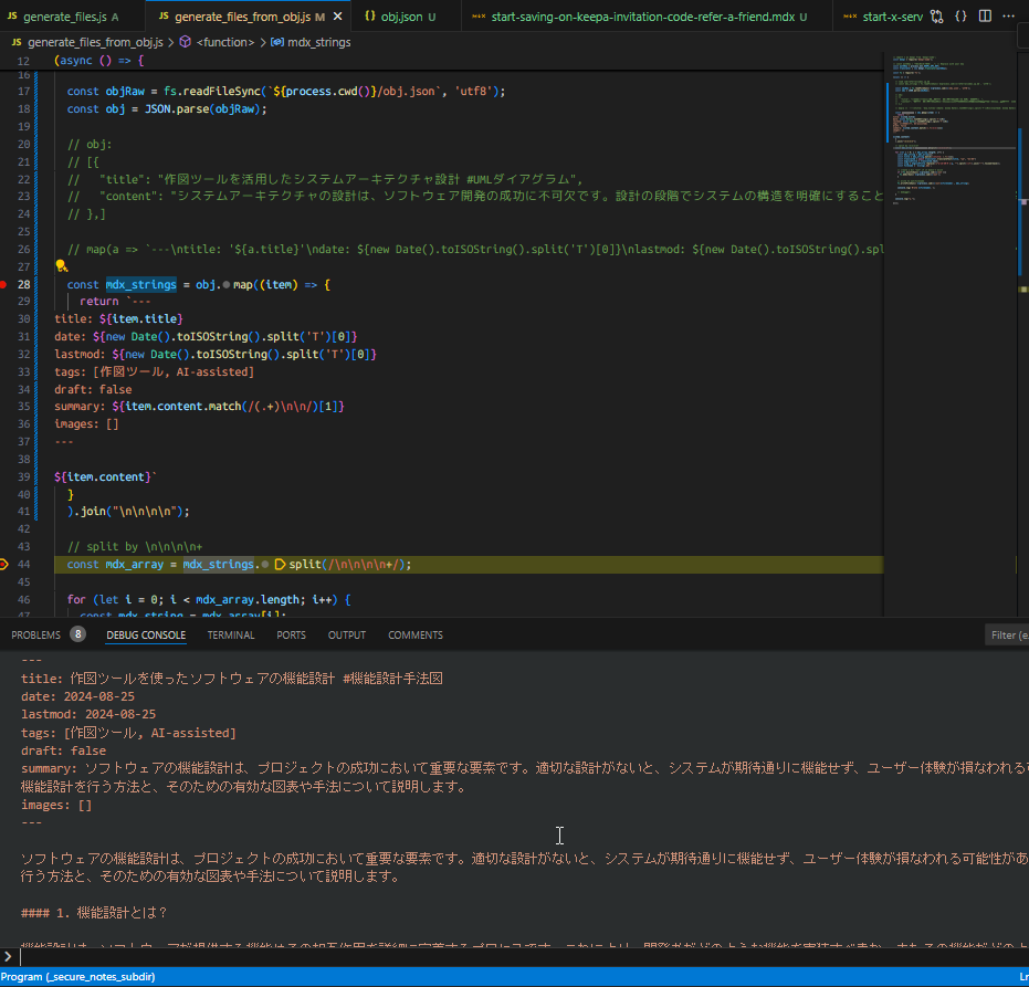 obj.map(a => `---\ntitle: '${a.title}'\ndate: ${new Date().toISOString().split('T')[0]}\nlastmod: ${new Date().toISOString().split('T')[0]}\ntags: [Zeichenwerkzeuge, KI-unterstützt]\ndraft: false\nsummary: '${a.content.match(/(.+)\n\n/)[1]}'\nimages: []\n---\n\n${a.content}`).forEach((a, i) => {